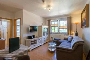 Den komfortabelt indrettede stue med fladskærms-tv og møbler af høj kvalitet samt en sofa (der kan bruges som en seng i fuld størrelse) inviterer dig til at slappe af. To separate soveværelser, det ene med dobbeltseng, det andet med futon-seng 140 cm x 200 cm og begge med klædeskab, er fuldt udstyrede. Vi stiller en barneseng og høj stol til rådighed for vores mindste gæster i din lejlighed på anmodning.