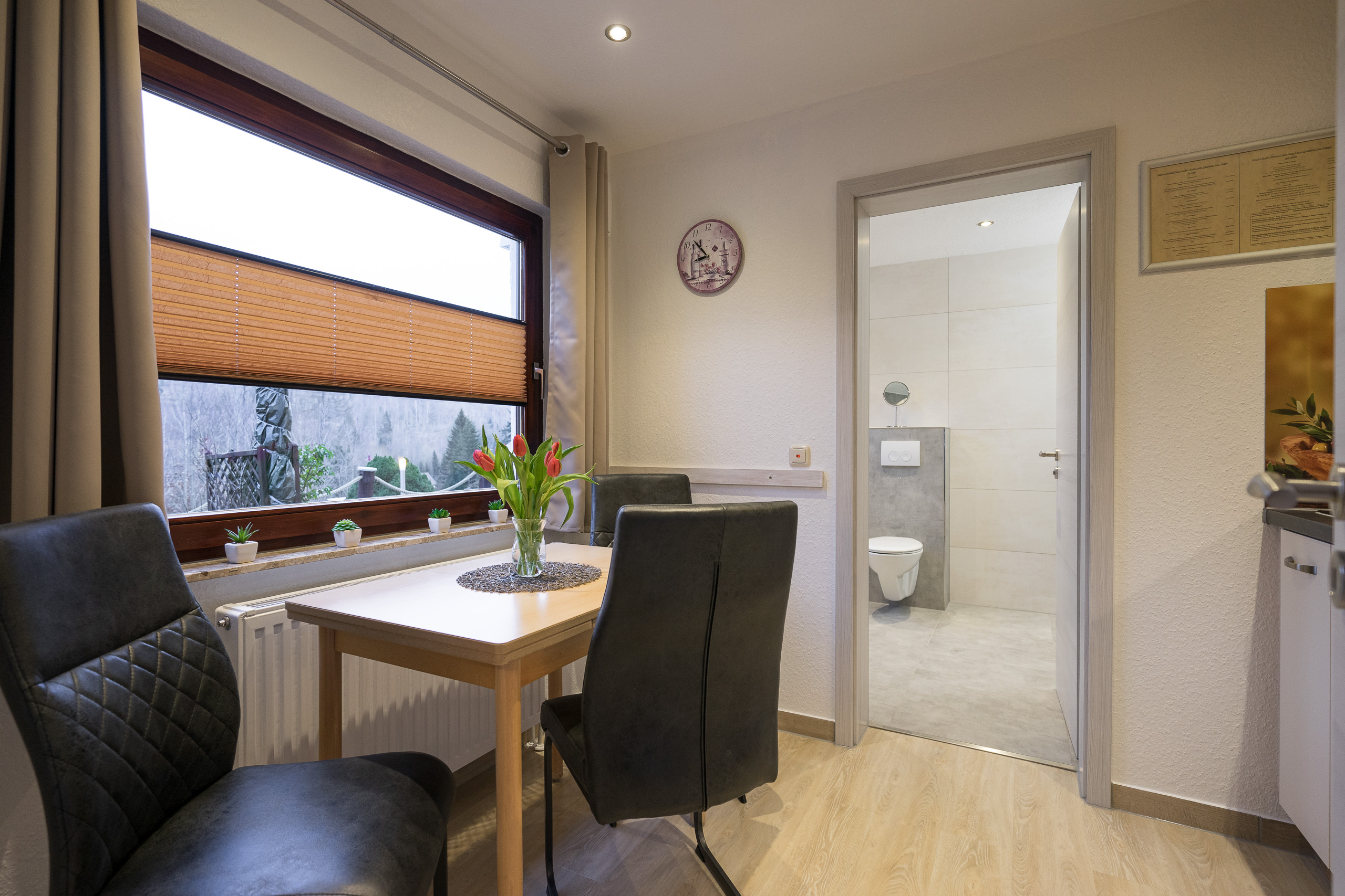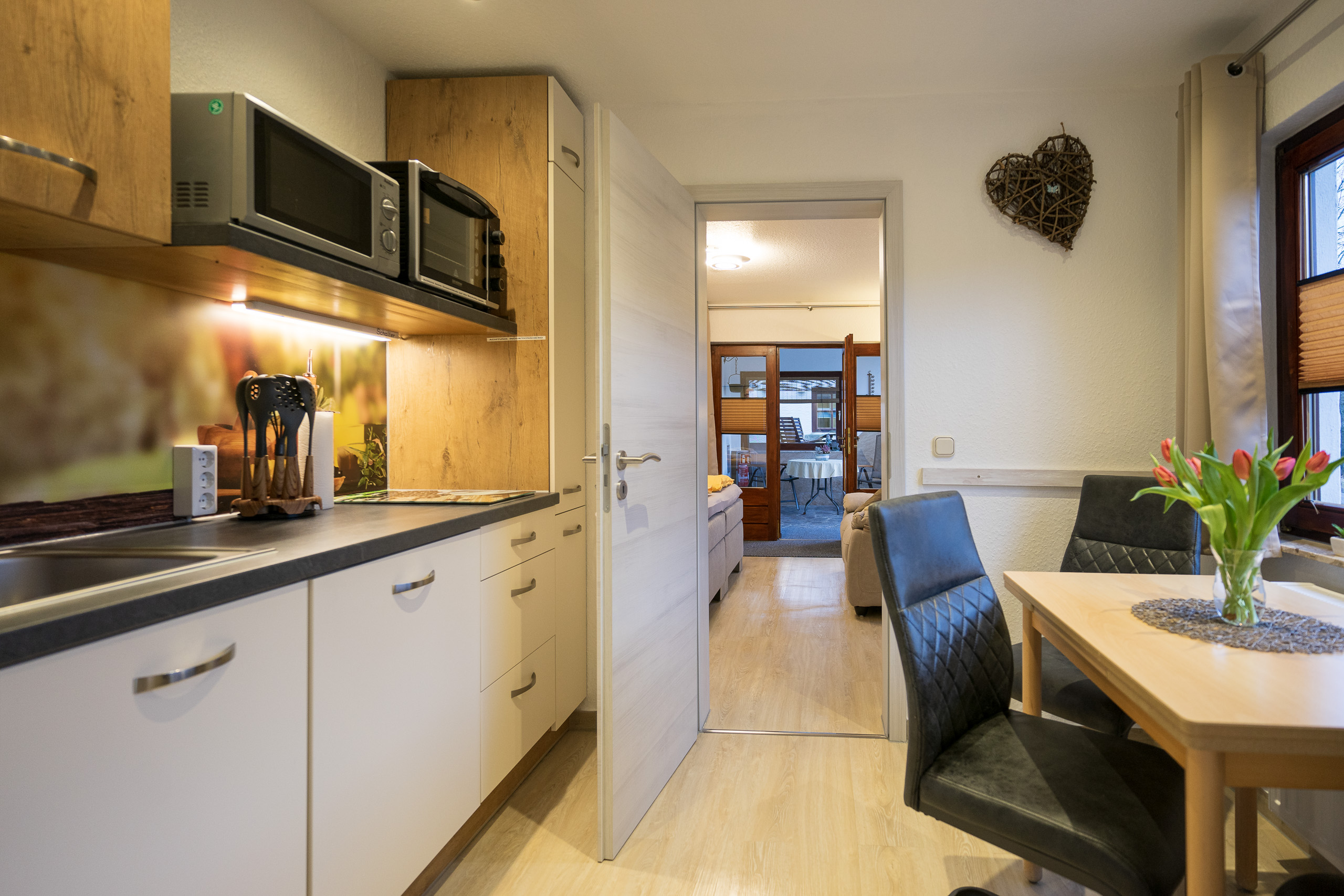 Die separate Küche bietet Ihnen ein Induktionskochfeld, einen kleinen Backofen, Wasserkocher, Kaffeemaschine, Toaster, Mikrowelle etc. sowie ein Esstisch steht ebenfalls bereit.