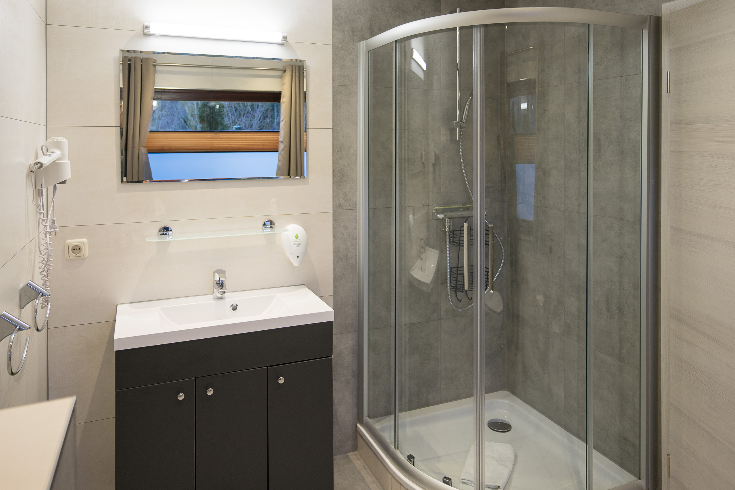 Im hellen Bad mit Fenster befinden sich eine Dusche & WC sowie ein Fön.