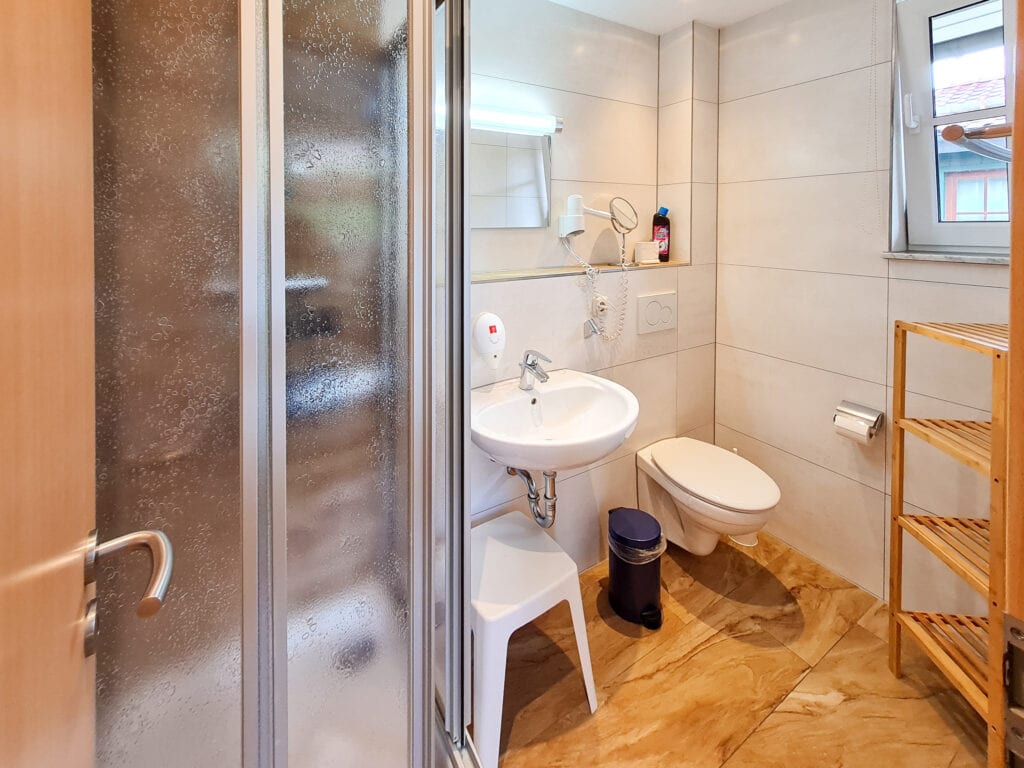 Im hellen Bad mit Fenster befindet sich eine Dusche & WC sowie ein Fön.